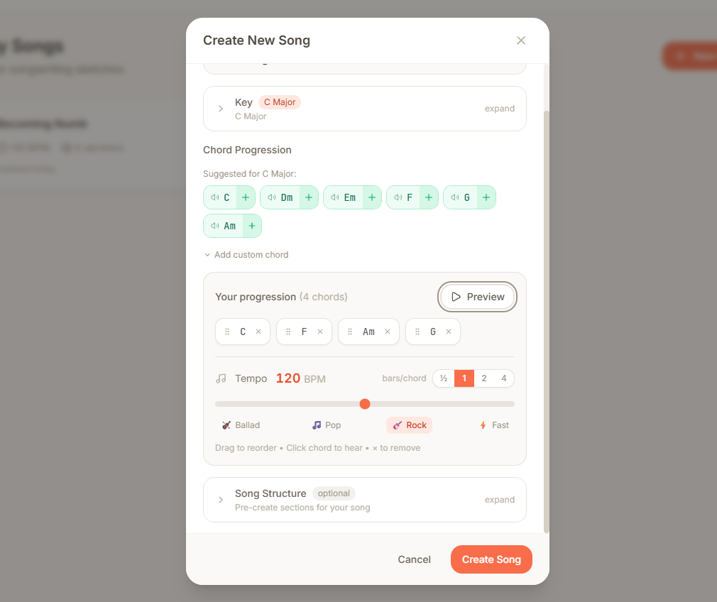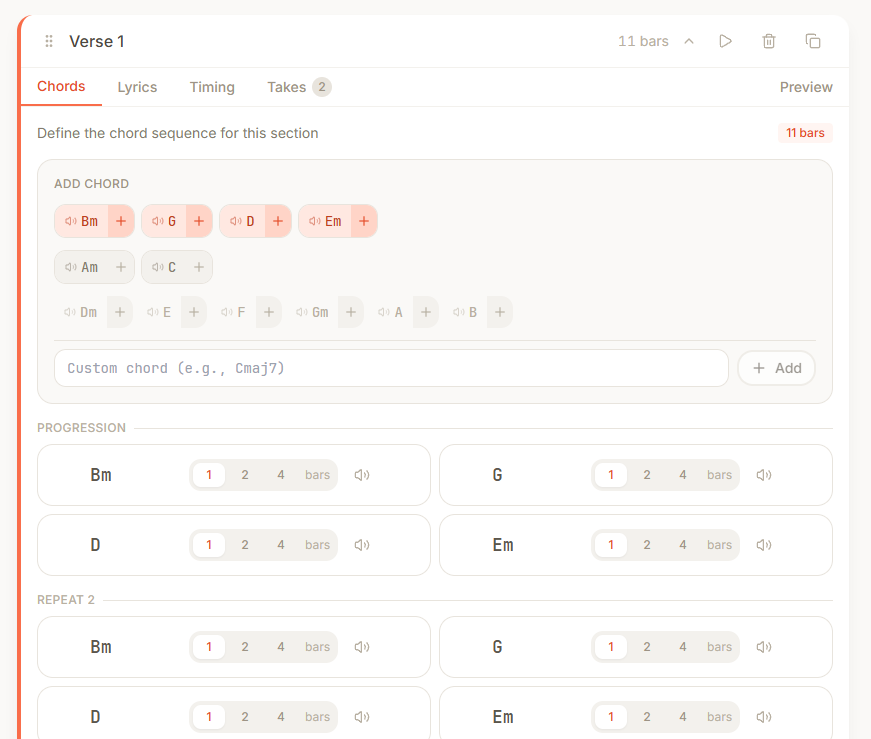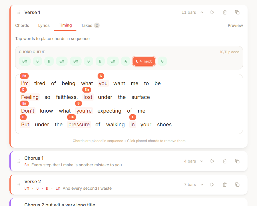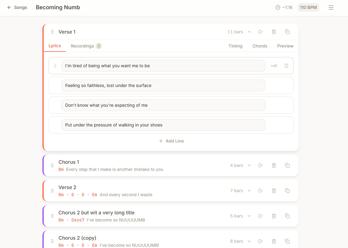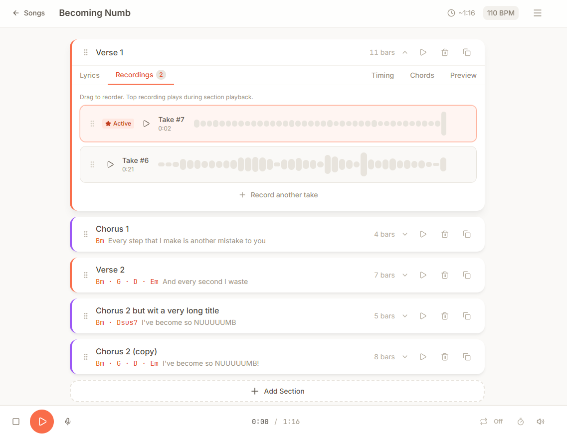 Start with a template (Verse-Chorus-Verse-Chorus-Bridge-Chorus) or build your own. Each section is independent, so you can perfect your chorus without touching anything else.