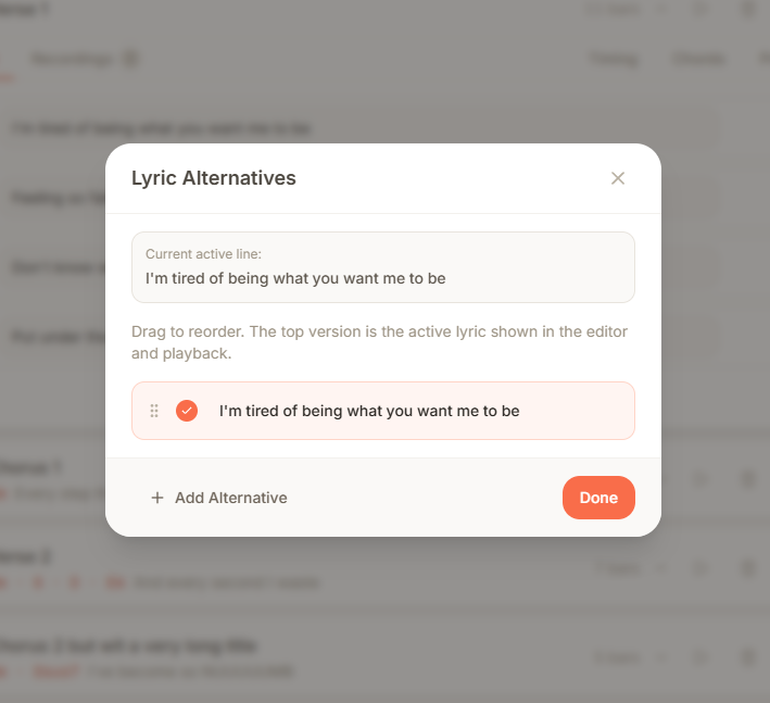 Hit record and sing over the chord progression. Don't like that take? Record another. Keep as many versions as you want. Only the one on top will be played.