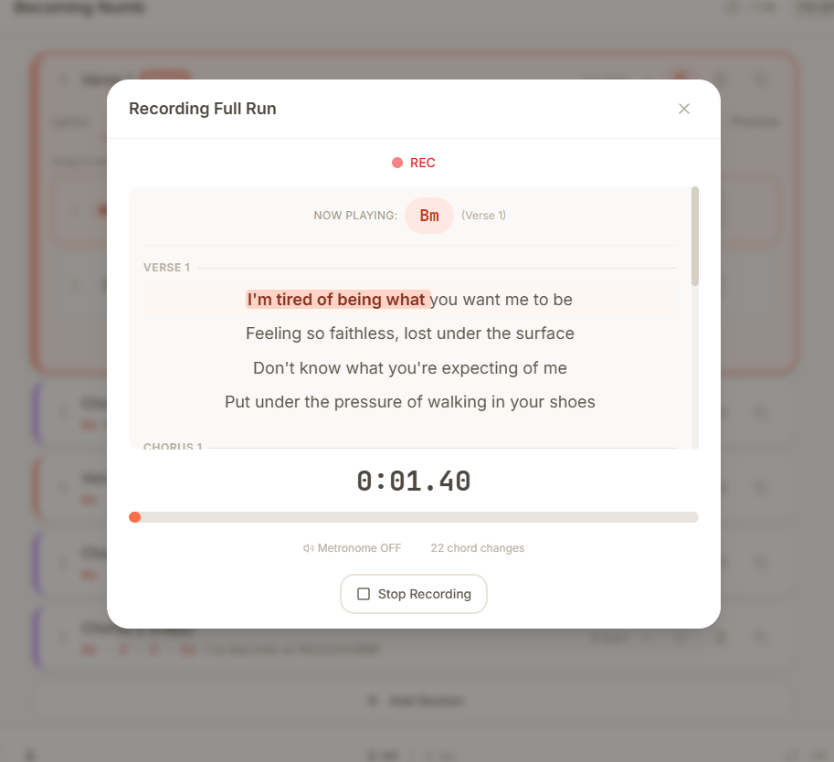 You can record per section or the whole song. A full run will be cropped automatically into the sections.