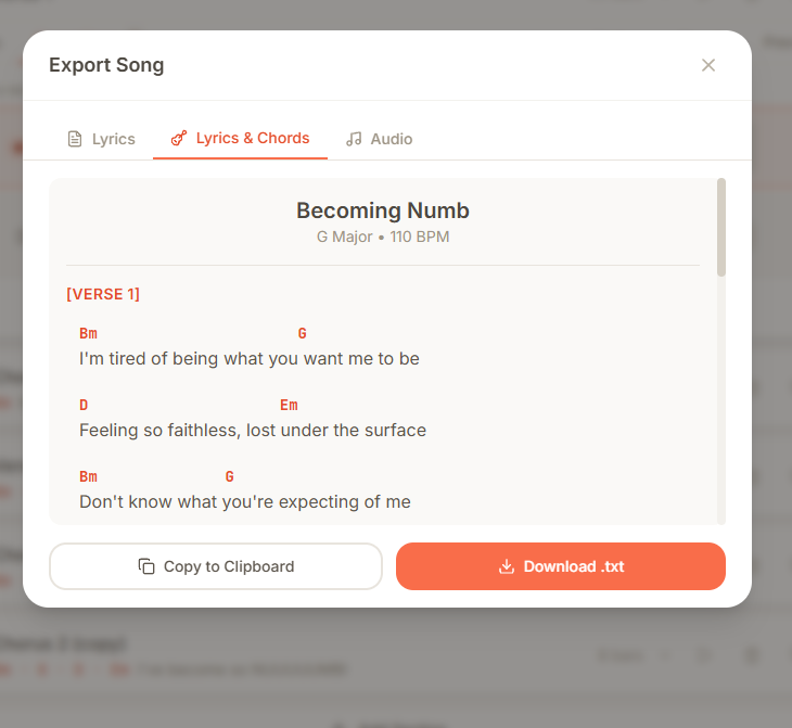 Work on your verse until it's perfect, then duplicate it. Your second verse now has the same chords and structure, ready for new lyrics. Change the final chorus slightly? Just edit that section.