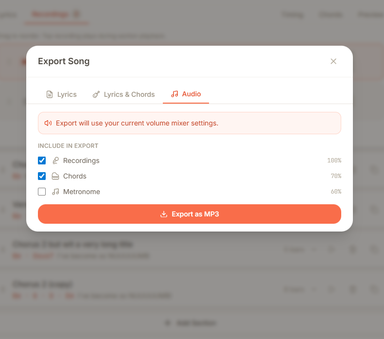Export to MP3 with your recordings, metronome, and chord changes. Take it to your DAW or just play along with your guitar.